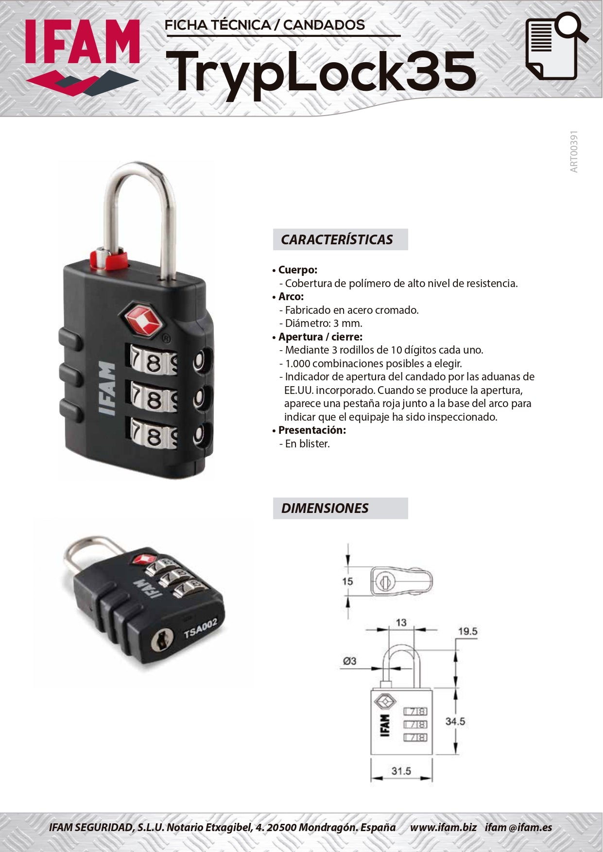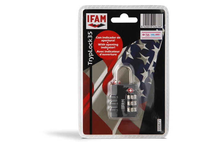 El candado de combinación TrypLock35 de IFAM es el indicado para asegurar su equipaje si viaja a Estados Unidos. El TrypLock35 cumple con la normativa TSA (Transportation Security Administration) de EE.UU., al permitir a los servicios de seguridad de los aeropuertos del país americano abrir y cerrar maletas para su inspección sin dañar el equipaje o el candado. Usted podrá saber si el candado ha sido abierto en la aduana, gracias a un indicador de color rojo situado en la base del arco.