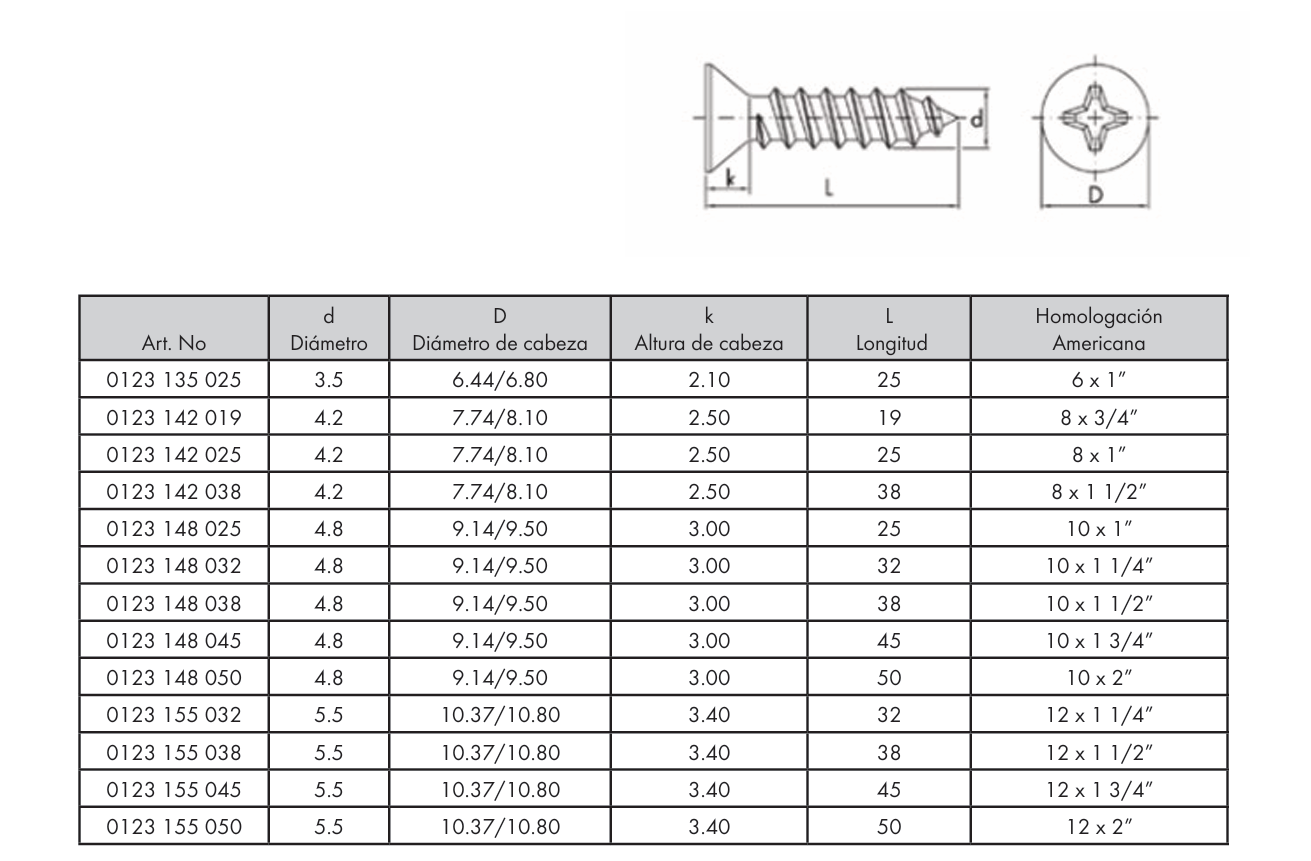 0123148038 Tornillo avellanado para lámina PH ZN 10 X 1-1/2" 4,8 X 38 mm