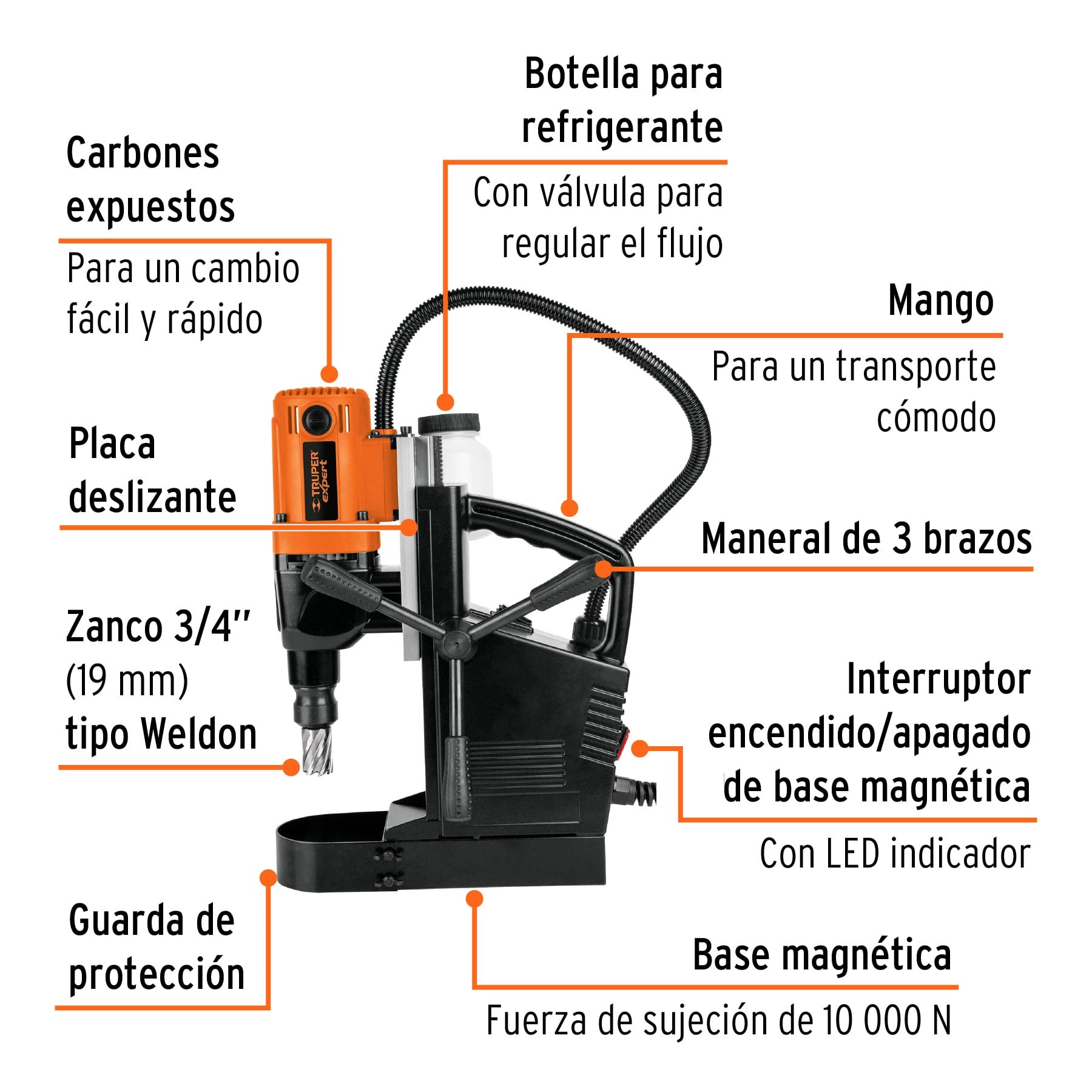 - Base magnética con poderosa fuerza de sujeción, que ofrece mayor precisión y estabilidad durante la perforación sobre estructuras metálicas