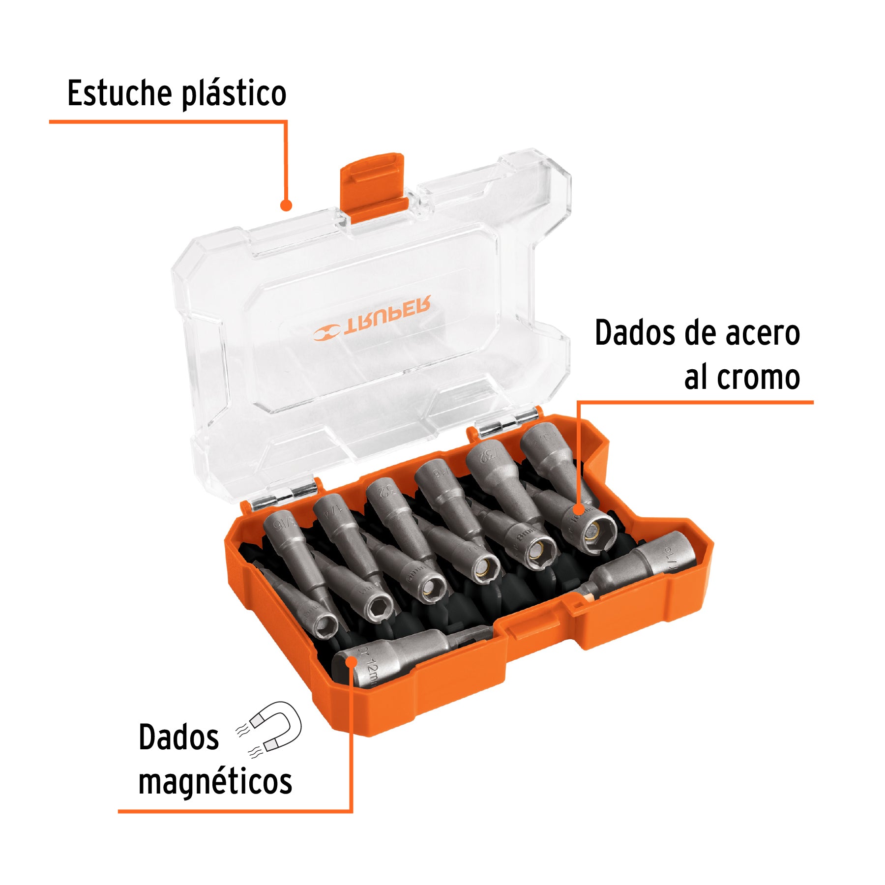 - 7 Dados magnéticos (3/16", 1/4", 9/32", 5/16", 11/32", 3/8" y 7/16")