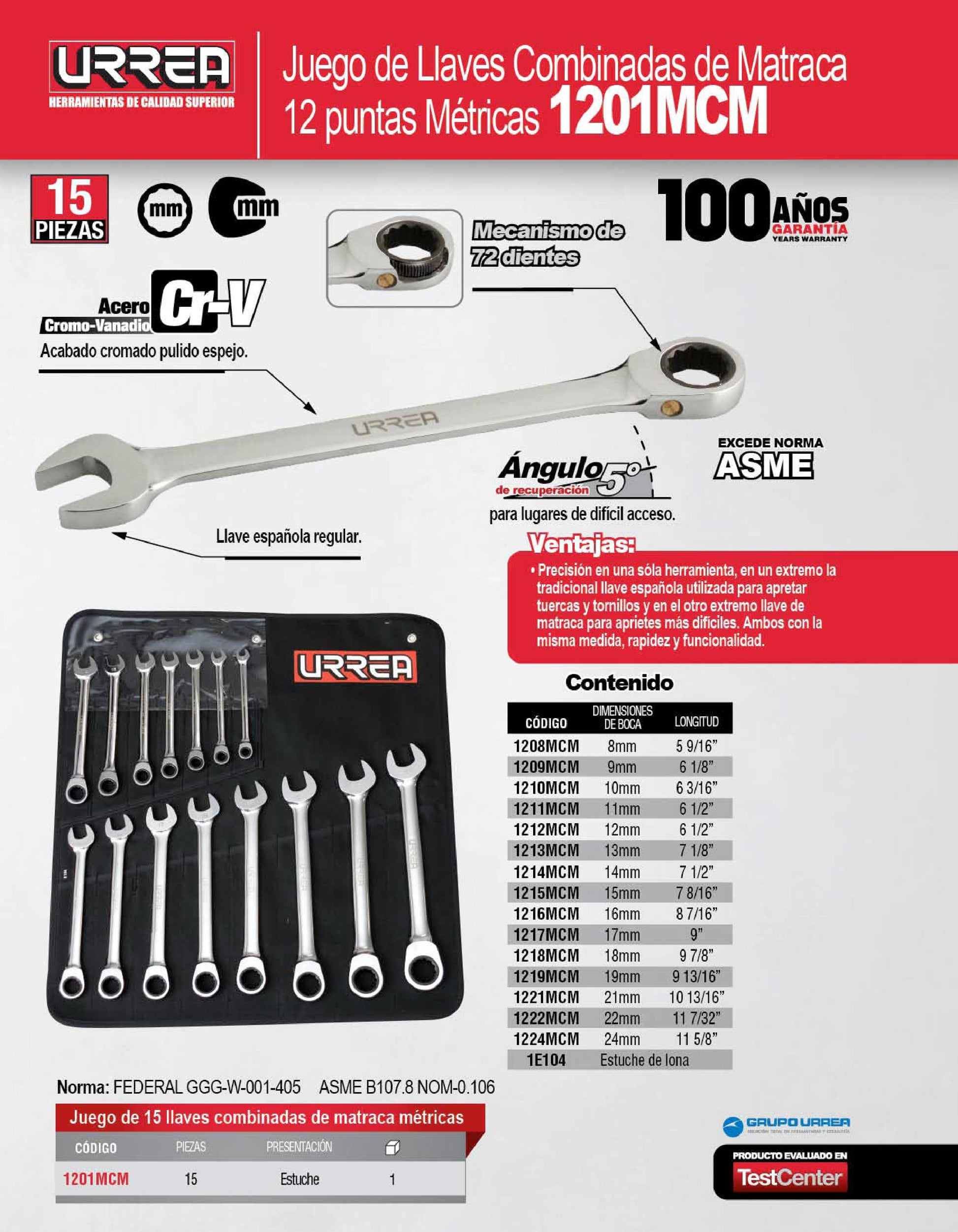 1201MCM Juego de llaves combinadas con ratchet pulido espejo 15 piezas 8 a 24 mm, uso pesado, Urrea
