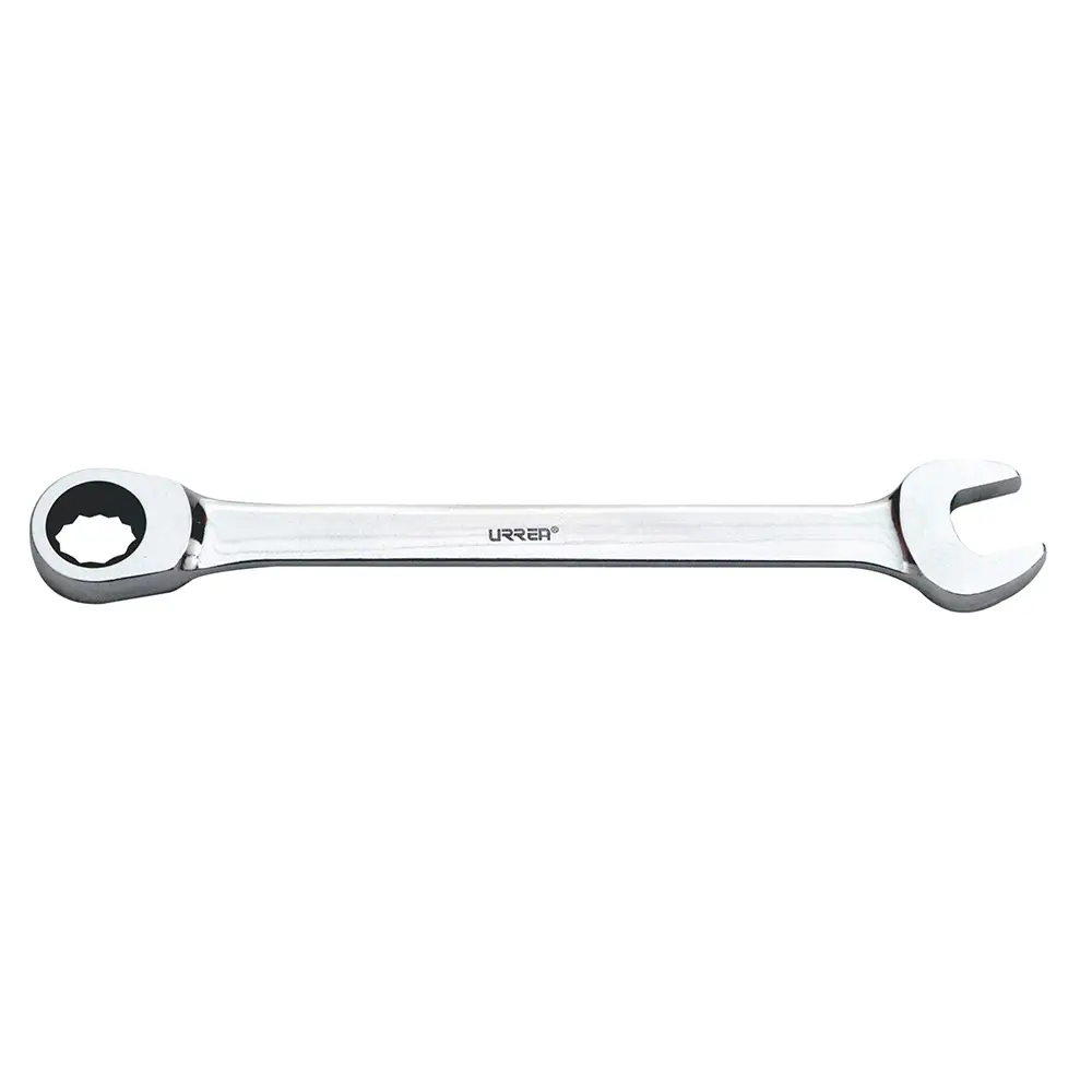 - Llave con un extremo tradicional española utilizada para apretar tuercas y tornillos y en el otro extremo llave reversible de matraca para aprietes más difíciles