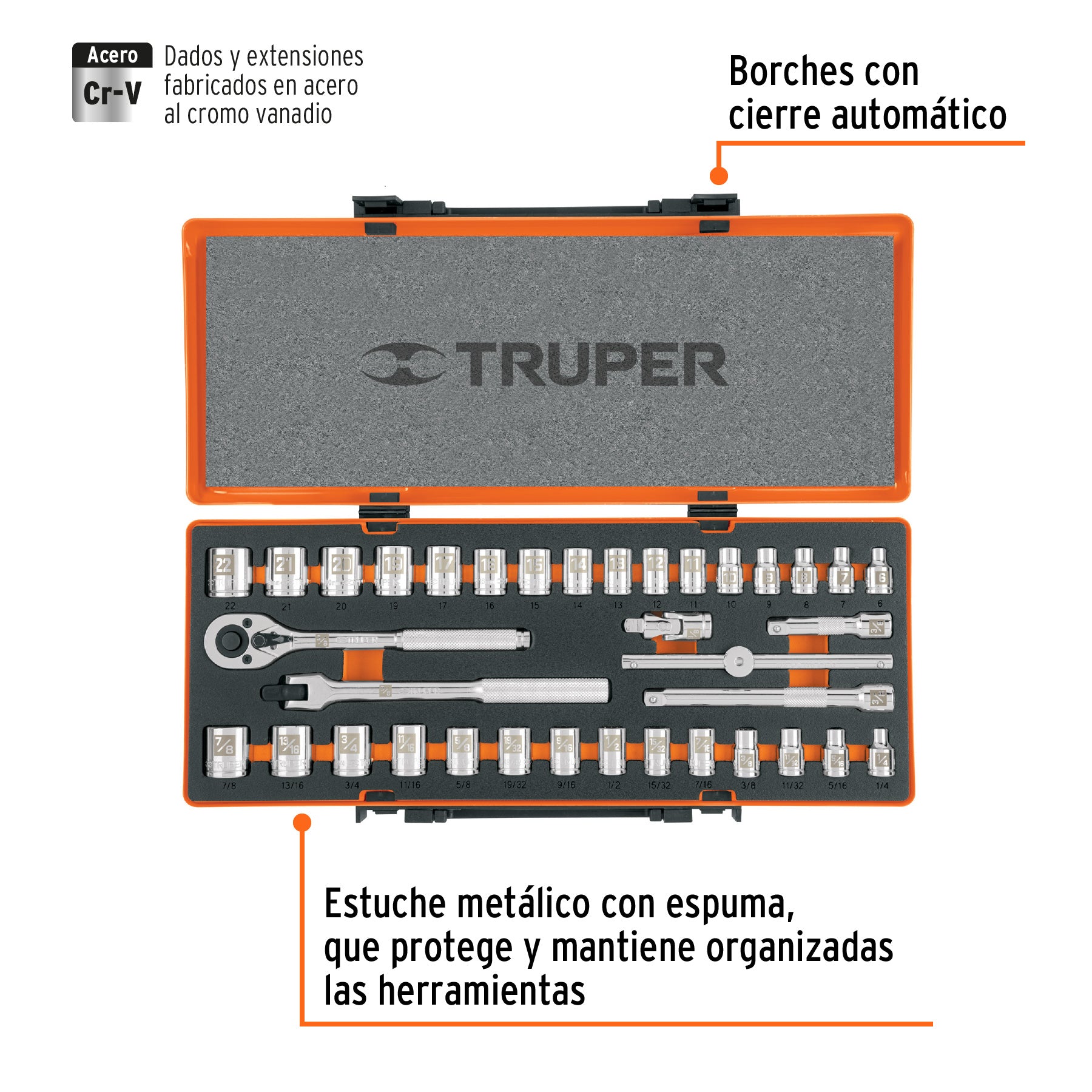 30 Dados 12 puntas: (16) 6 a 22 mm, (14) 1/4" a 7/8"