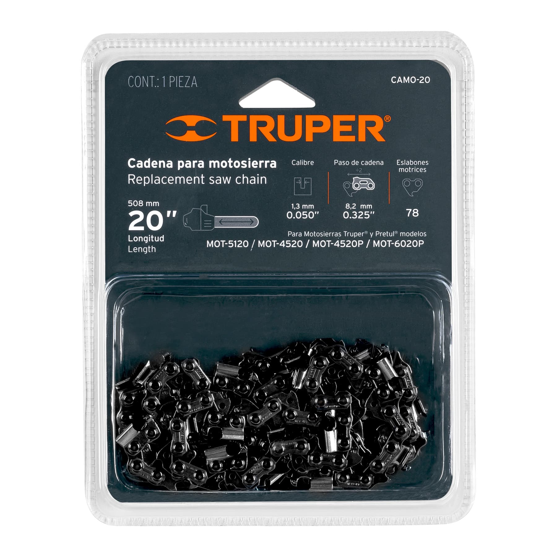 - Para motosierras modelos MOT-5020, MOT-5120, MOT-4520 marca Truper® y MOT-5220P, MOT-6020P, MOT-4520P marca Pretul®
