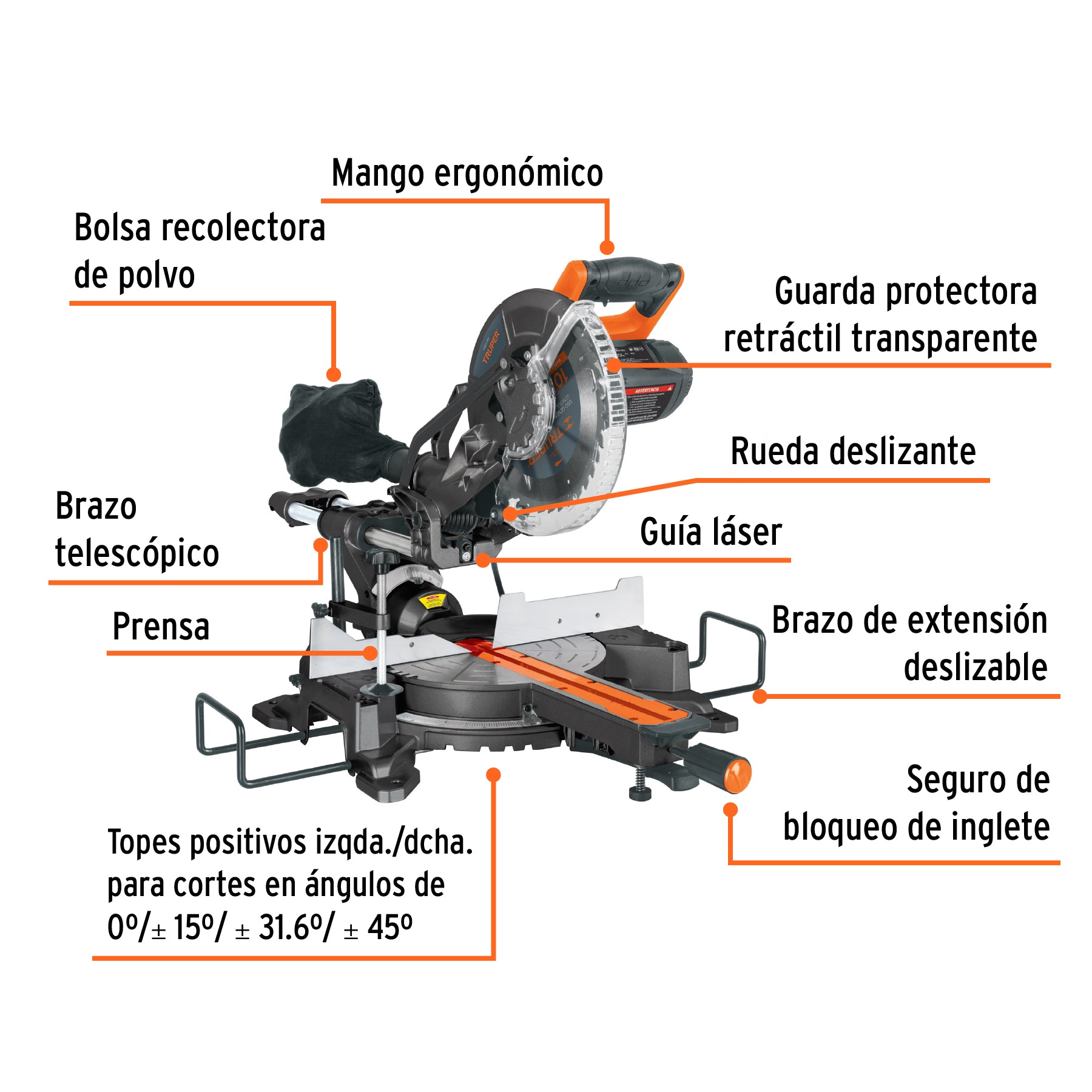 - Brazo telescópico para mayor capacidad de corte (80 mm alto y 310 mm ancho)