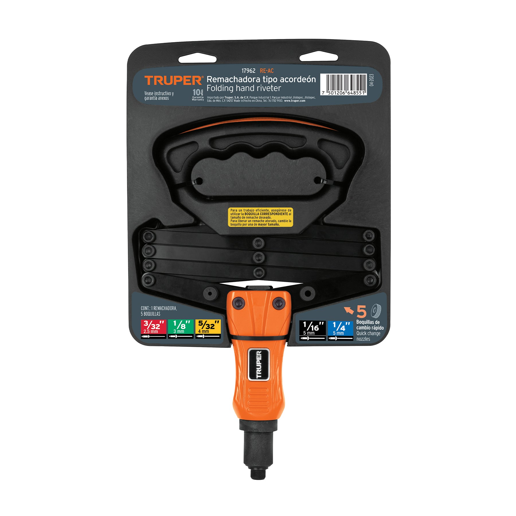 - 5 boquillas intercambiables con indicador de color para fácil identificación de remaches: 3/32", 1/8", 5/32", 3/16" y 1/4"