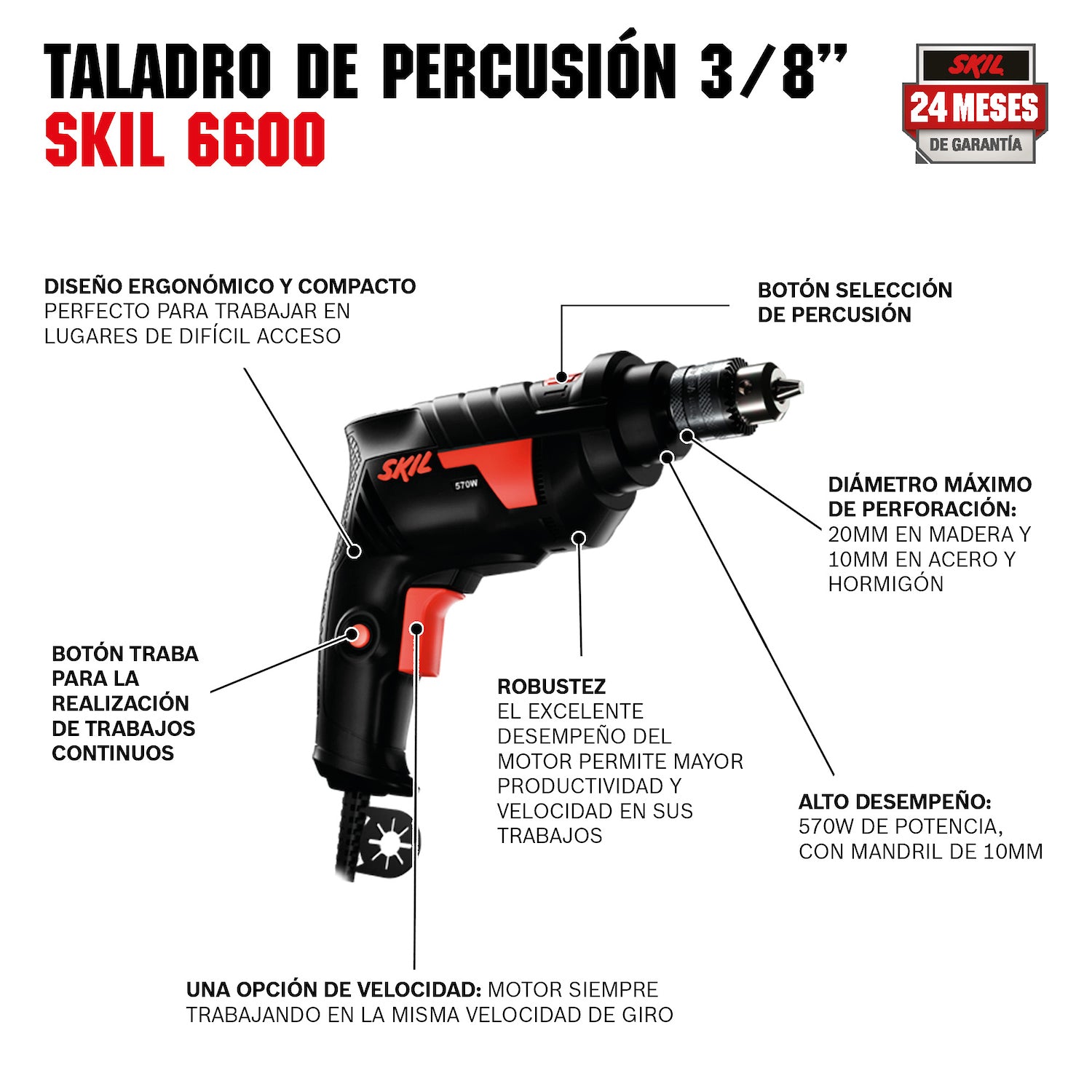 ¡El Taladro percutor Skil 6660 posee 570 Watts de potencia, es súper liviano y compacto! El Mandril metálico de 3/8" (10 milímetros) es robusto para las aplicaciones diarias. Con el botón conmutador para perforaciones con o sin impacto es posible realizar perforaciones en distintos materiales tales como: albañilería, hormigón, madera, metal, con el botón de bloqueo es posible realizar trabajos continuos. El Taladro percutor Skil 6600 en este modelo es suministrado con 1 Llave de mandril en Caja de cartón.. Es indicada para el profesional autónomo y cuenta con 2 años de garantía.