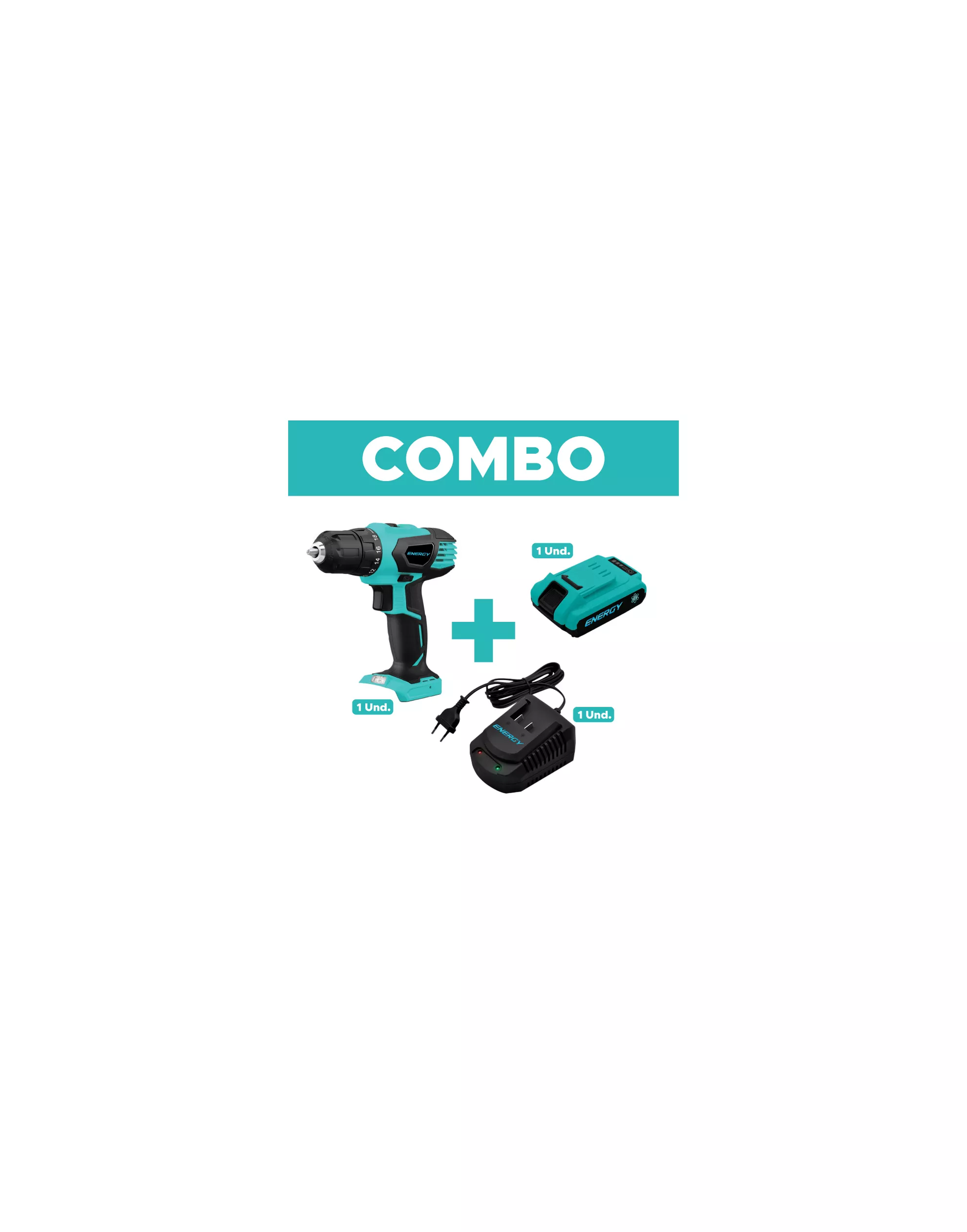 Este combo incluye: Taladro Inalámbrico 18V sin batería ni cargador. Mandril de 13mm (1/2"). 2 velocidades: 0-400/ 0-1400RPM. Luz led de trabajo. Indicador LED de carga de bateria. Mandril Autoajustable. Diseño compacto, ergonomico y liviano. Torque máximo 35Nm. Peso 1.23 Kg. Batería de tecnología Ion de Litio para universo de herramientas recargables 18 Voltios. Amperaje 2.0Ah. Carga rápida en tan solo 30 minutos (1/2 hora). Cargador de baterías 18 voltios Worktools Datos de entrada: Tensión nominal 100-240 V. Frecuencia 50-60Hz Potencia 36 W: Datos de salida: Tensión nominal 22V. Corriente nominal 2.2A